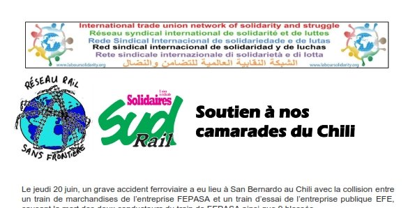 Les organisations membres du Réseau syndical international de solidarité et de luttes, dont est membre la fédération SUD-Rail, soutiennent les travailleurs et les travailleuses d’EFE (Chili) et leur organisation syndicale Federaciones de Transporte Ferroviario de Carga y Pasajeros dans leur lutte !
