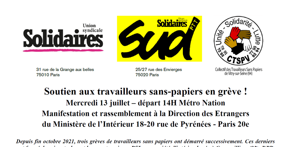 Soutien aux travailleurs sans papiers en grève : Manifestation et rassemblement le 13 juillet à la Direction des Etrangers