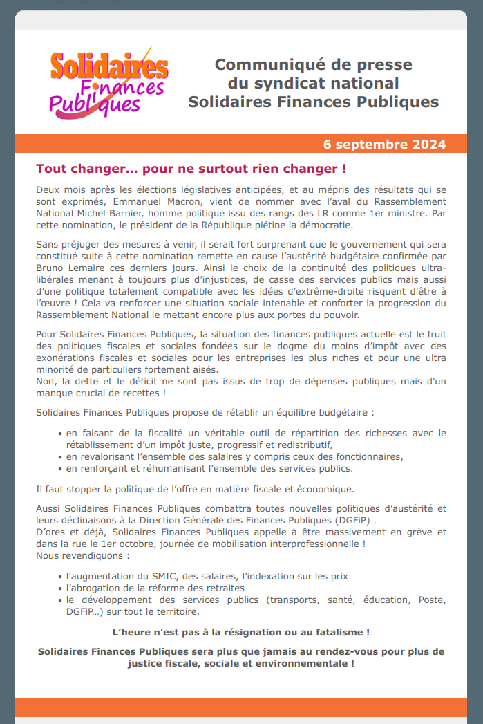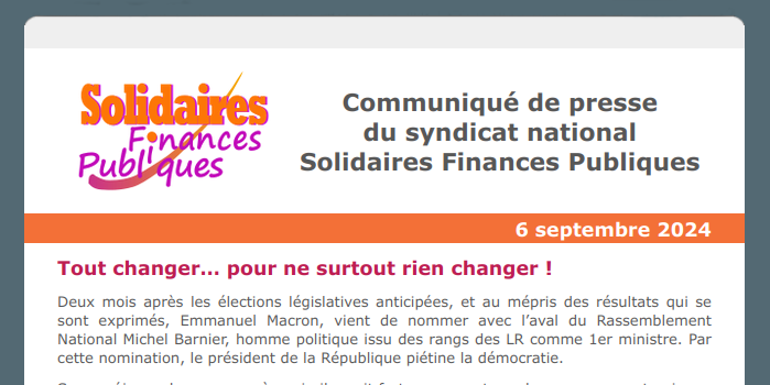 Sans préjuger des mesures à venir, il serait fort surprenant que le gouvernement qui sera constitué suite à cette nomination remette en cause l’austérité budgétaire confirmée par Bruno Lemaire ces derniers jours. Ainsi le choix de la continuité des politiques ultra-libérales menant à toujours plus d’injustices, de casse des services publics mais aussi d’une politique totalement compatible avec les idées d’extrême-droite risquent d’être à l’œuvre ! Cela va renforcer une situation sociale intenable et conforter la progression du Rassemblement National le mettant encore plus aux portes du pouvoir.