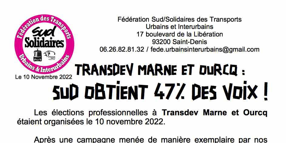 Transdev Marne et Ourcq : les listes Sud/Solidaires obtiennent plus de 47% des voix aux élections professionnelles !