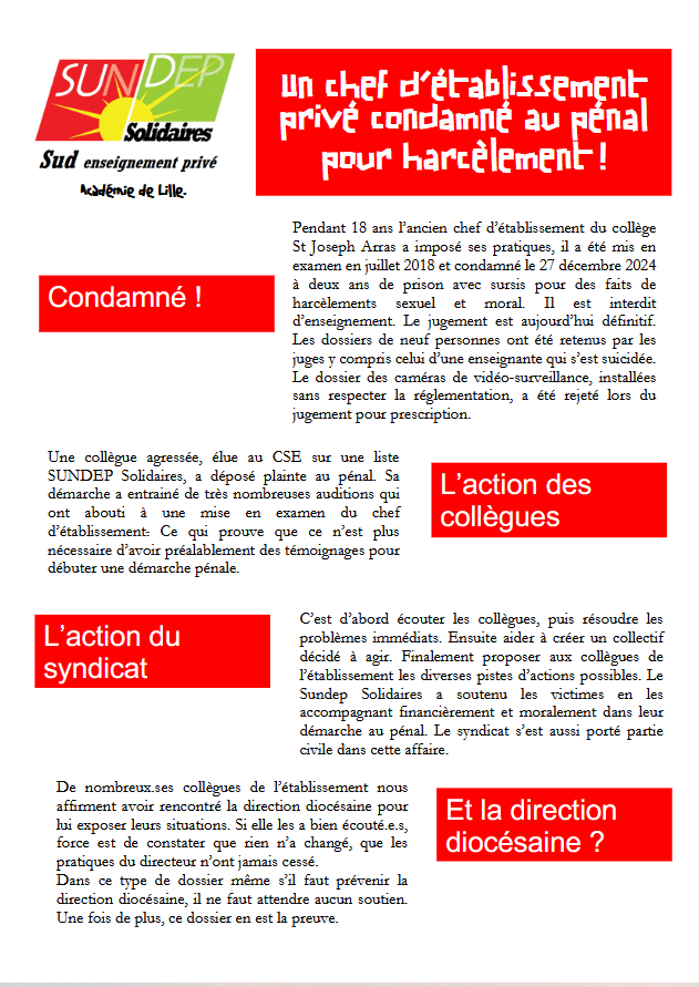 Pendant 18 ans l’ancien chef d’établissement du collège St Joseph Arras a imposé ses pratiques, il a été mis en examen en juillet 2018 et condamné le 27 décembre 2024 à deux ans de prison avec sursis pour des faits de harcèlements sexuel et moral. Le jugement est