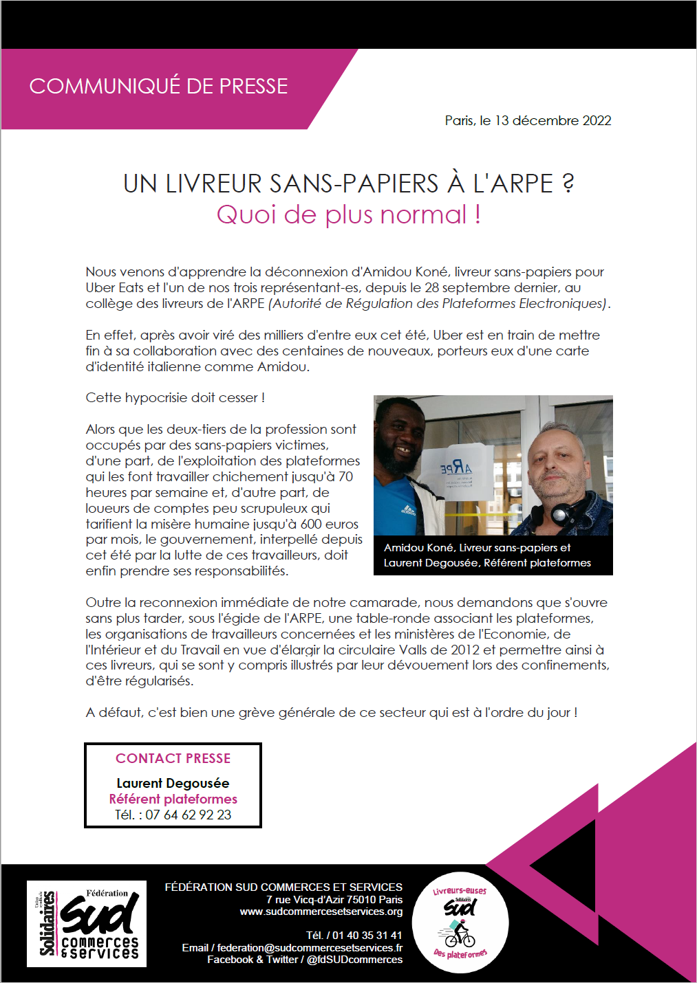 Outre la reconnexion immédiate de notre camarade, nous demandons que s'ouvre sans plus tarder, sous l'égide de l'ARPE, une table-ronde associant les plateformes, les organisations de travailleurs concernées et les ministères de l'Economie, de l'Intérieur et du Travail en vue d'élargir la circulaire Valls de 2012 et permettre ainsi à ces livreurs, qui se sont y compris illustrés par leur dévouement lors des confinements, d'être régularisés.