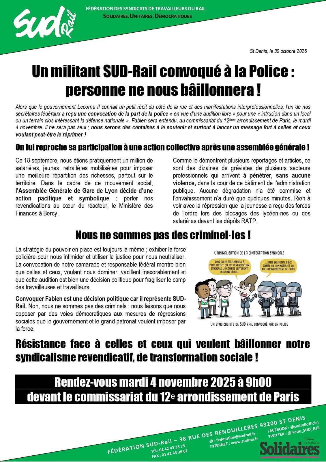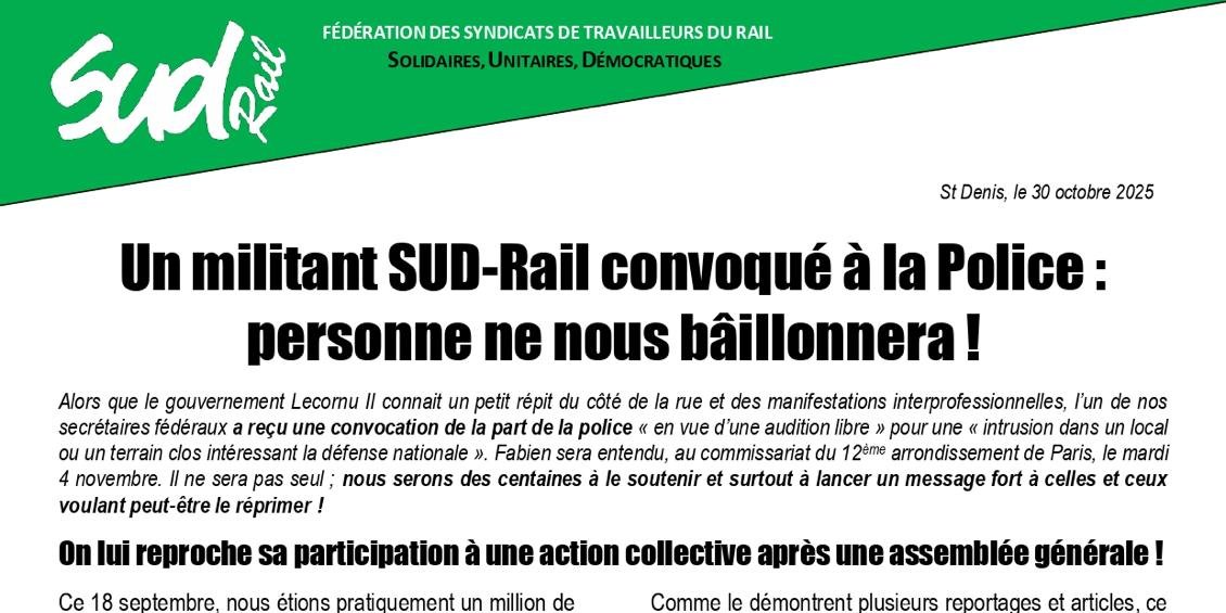 Alors que le gouvernement Lecornu II connait un petit répit du côté de la rue et des manifestations interprofessionnelles, l’un de nos secrétaires fédéraux a reçu une convocation de la part de la police « en vue d’une audition libre » pour une « intrusion dans un local ou un terrain clos intéressant la défense nationale ». Fabien sera entendu, au commissariat du 12ème arrondissement de Paris, le mardi 4 novembre. Il ne sera pas seul ; nous serons des centaines à le soutenir et surtout à lancer un message fort à celles et ceux voulant peut-être le réprimer !