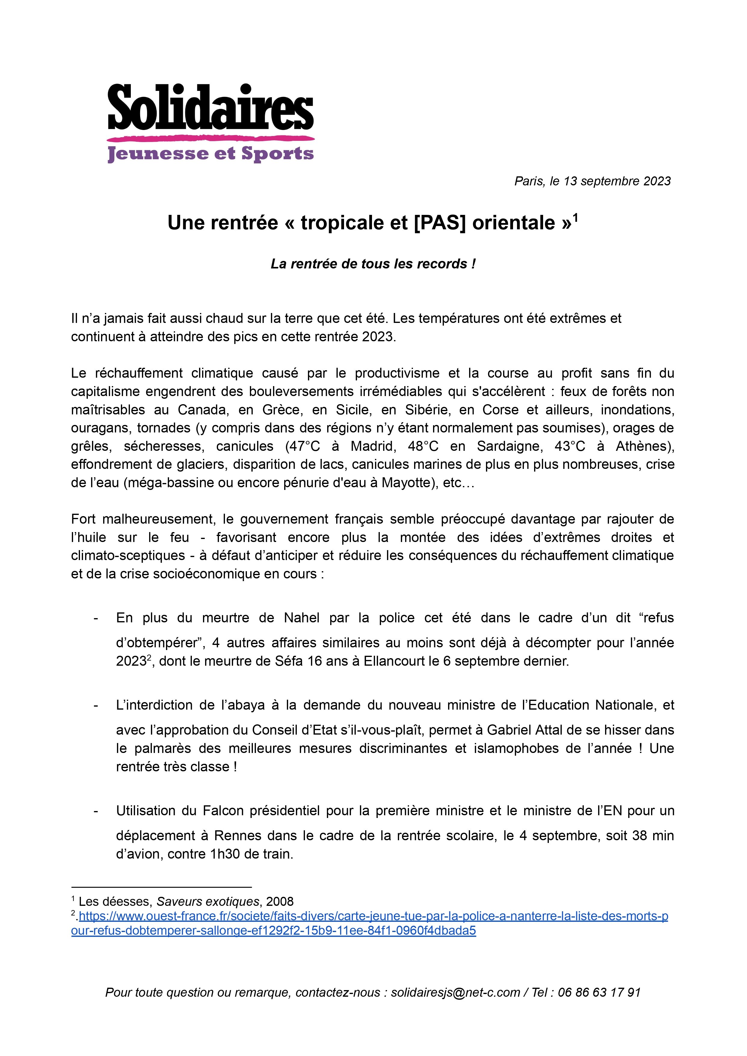 Pour jeunesse et sports particulièrement, il est édifiant d’observer une rentrée 2023 - la 3eme à l’éducation nationale - où le manque de moyens humains et matériels, l’absence d’une politique JS ambitieuse ainsi que la perte de sens liée à la casse des métiers et du service public se conjuguent intensément et très largement dans tous les territoires de France Métropolitaine et d’Outre-Mer !