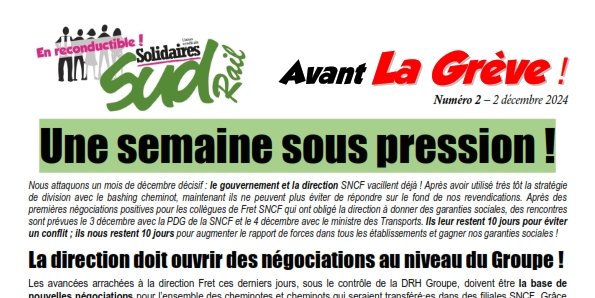 Nous attaquons un mois de décembre décisif : le gouvernement et la direction SNCF vacillent déjà ! Après avoir utilisé très tôt la stratégie de division avec le bashing cheminot, maintenant ils ne peuvent plus éviter de répondre sur le fond de nos revendications. Après des premières négociations positives pour les collègues de Fret SNCF qui ont obligé la direction à donner des garanties sociales, des rencontres sont prévues le 3 décembre avec la PDG de la SNCF et le 4 décembre avec le ministre des Transports. Ils leur restent 10 jours pour éviter un conflit ; ils nous restent 10 jours pour augmenter le rapport de forces dans tous les établissements et gagner nos garanties sociales !