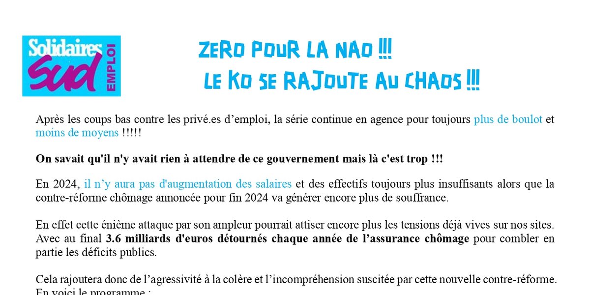 En 2024, il n’y aura pas d'augmentation des salaires et des effectifs toujours plus insuffisants alors que la contre-réforme chômage annoncée pour fin 2024 va générer encore plus de souffrance.