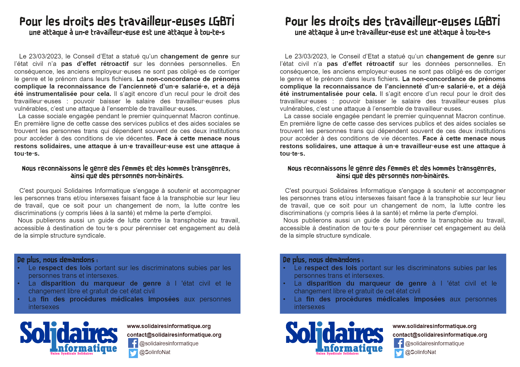 C’est pourquoi Solidaires Informatique s’engage à soutenir et accompagner les personnes trans et/ou intersexes faisant face à la transphobie sur leur lieu de travail, que ce soit pour un changement de nom, la lutte contre les discriminations (y compris liées à la santé) et même la perte d’emploi.