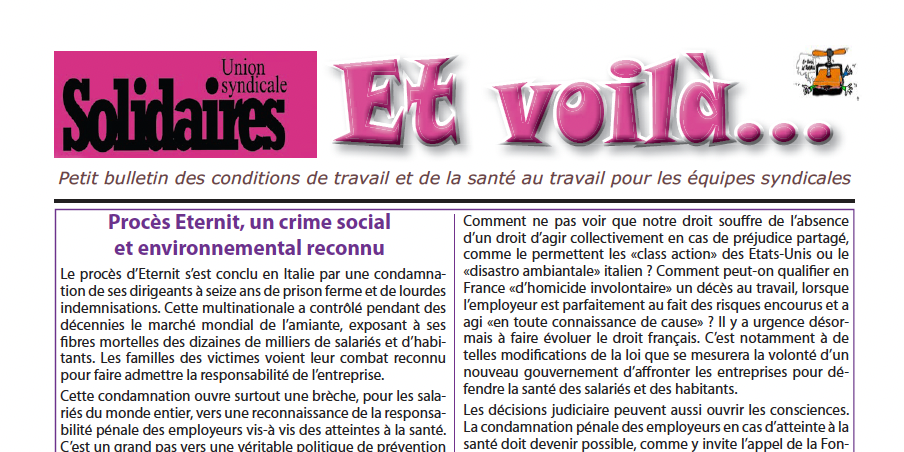 - Tribune Procès Eternit, un crime social et environnemental reconnu ;