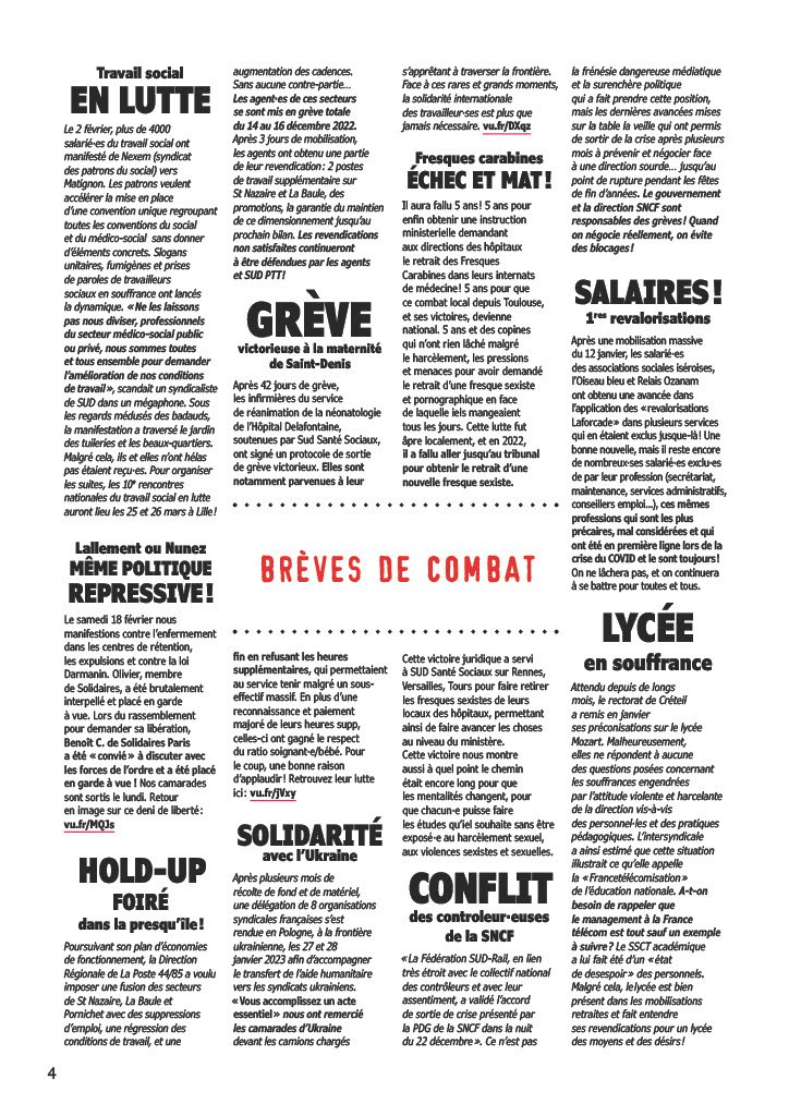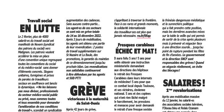 Le 2 février, plus de 4000 salarié-es du travail social ont manifesté de Nexem (syndicat des patrons du social) vers Matignon. Les patrons veulent accélérer la mise ne place d’une convention unique regroupant toutes les conventions du social et du médico-social sans donner d'éléments concrets. Slogans unitaires, fumigènes et prises de paroles de travailleurs sociaux en souffrance ont lancés la dynamique. « Ne les laissons pas nous diviser, professionnels du secteur médico-social public ou privé, nous sommes toutes et tous ensemble pour demander l’amélioration de nos conditions de travail », scandait un syndicaliste de SUD dans un mégaphone. Sous les regards médusés des badauds, la manifestation a traversé le jardin des tuileries et les beaux-quartiers. Malgré cela, ils et elles n’ont hélas pas étaient reçu-es. Pour organiser les suites, les 10emes rencontres nationales du travail social en lutte auront lieu les 25 et 26 mars à Lille !!