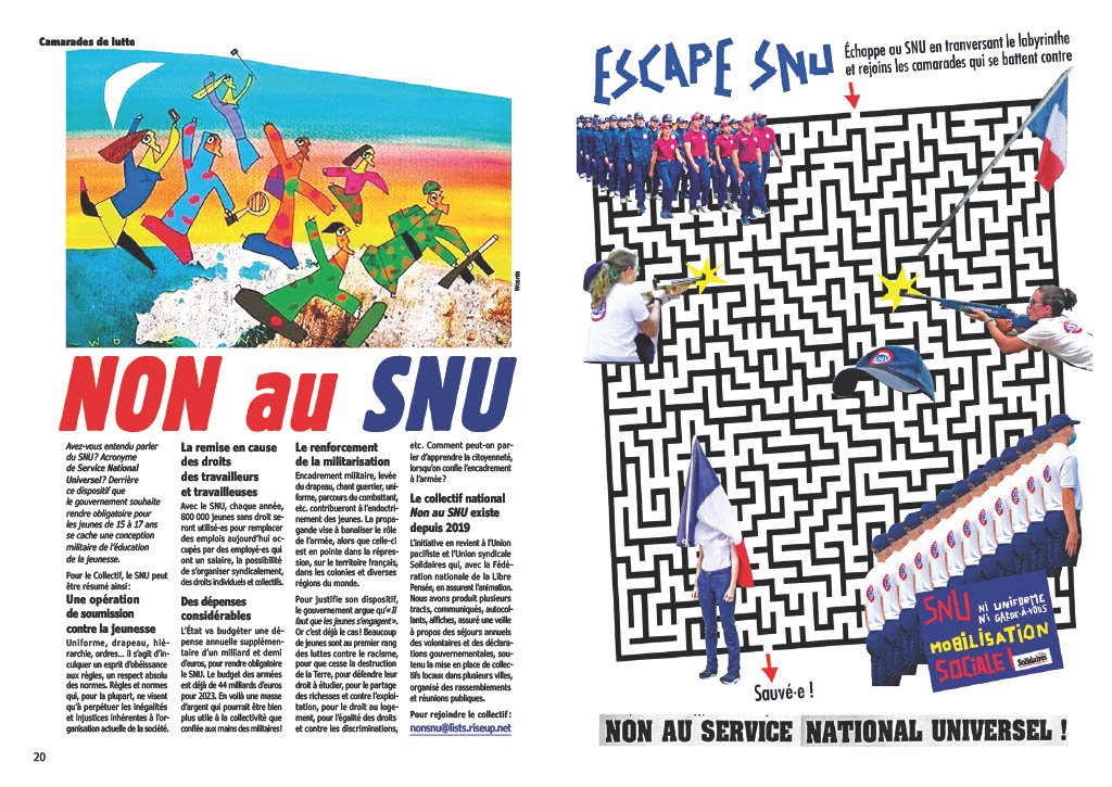 La remise en cause des droits des travailleurs et travailleuses : avec le SNU, chaque année, 800 000 jeunes sans droit seront utilisé∙es pour remplacer des emplois aujourd’hui occupés par des employé∙es qui ont un salaire, la possibilité de s’organiser syndicalement, des droits individuels et collectifs.