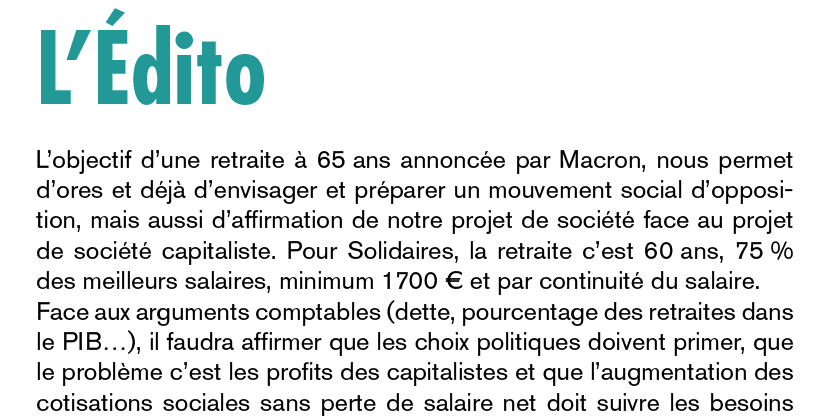 L’objectif d’une retraite à 65 ans annoncée par Macron, nous permet d’ores et déjà d’envisager et préparer un mouvement social d’opposition, mais aussi d’affirmation de notre projet de société face au projet de société capitaliste. Pour Solidaires, la retraite c’est 60 ans, 75 % des meilleurs salaires, minimum 1700 € et par continuité du salaire.