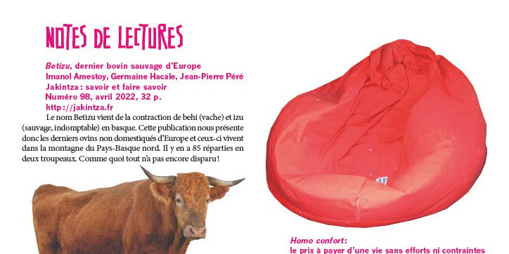 Le nom Betizu vient de la contraction de behi (vache) et izu (sauvage, indomptable) en basque. Cette publication nous présente donc les derniers ovins non domestiqués d’Europe et ceux-ci vivent dans la montagne du Pays-Basque nord. Il y en a 85 réparties en deux troupeaux. Comme quoi tout n’a pas encore disparu !