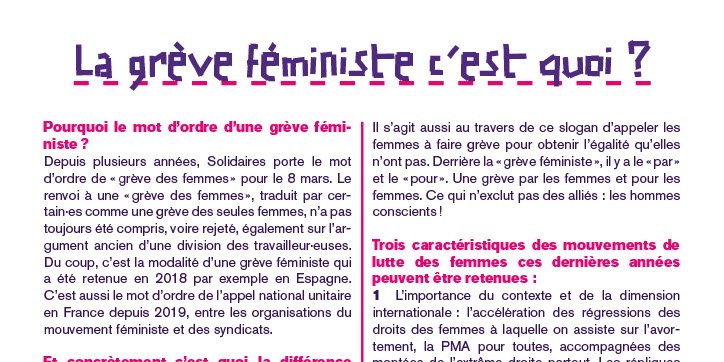 Depuis plusieurs années, Solidaires porte le mot d’ordre de « grève des femmes » pour le 8 mars. Le renvoi à une « grève des femmes », traduit par certain·es comme une grève des seules femmes, n’a pas toujours été compris, voire rejeté, également sur l’argument ancien d’une division des travail- leur·euses. Du coup, c’est la modalité d’une grève féministe qui a été retenue en 2018 par exemple en Espagne. C’est aussi le mot d’ordre de l’appel national unitaire en France depuis 2019, entre les organisations du mouvement féministe et des syndicats.