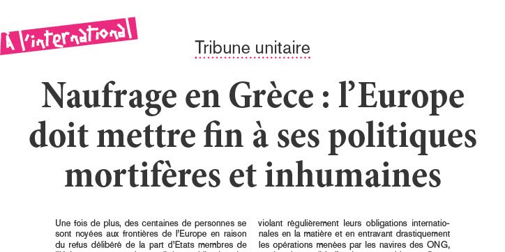 À l'heure où nous écrivons ces lignes, des centaines de personnes, y compris de nombreux enfants, sont portées disparues et présumées mortes au large des côtes grecques. On ne sait combien exactement se trouvaient à bord du navire naufragé, mais les témoignages font état de passagers entassés sous le pont lui-même surchargé. Ce bateau était de fait en détresse, ce qui ne devrait pas autoriser les garde-côtes grecs à justifier leur inaction en arguant que les passagers auraient refusé les secours. En effet, un avion de Frontex a survolé le navire quelques heures avant le naufrage et l’a signalé aux autorités grecques et italiennes plusieurs heures avant qu'il ne chavire, ce qui aurait dû amener les autorités grecques à déclencher immédiatement une opération de sauvetage dans cette zone de recherche et de sauvetage placée sous leur responsabilité.